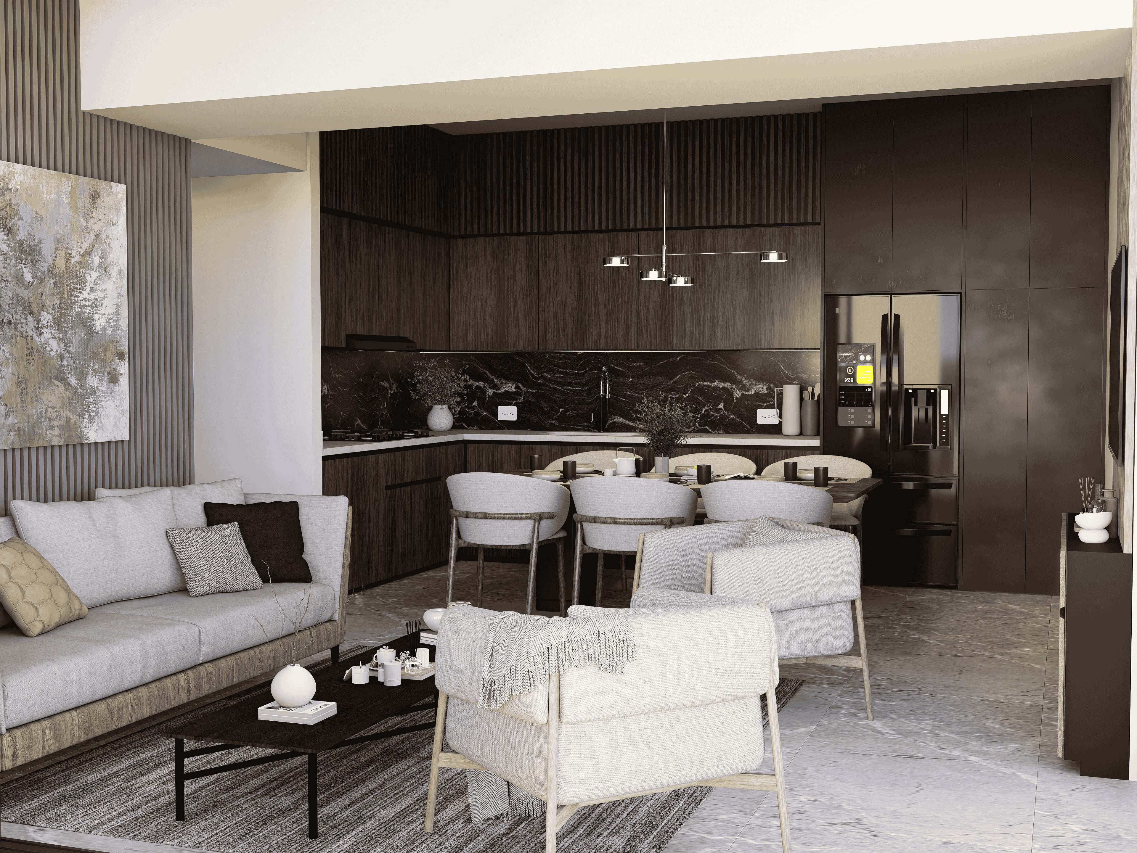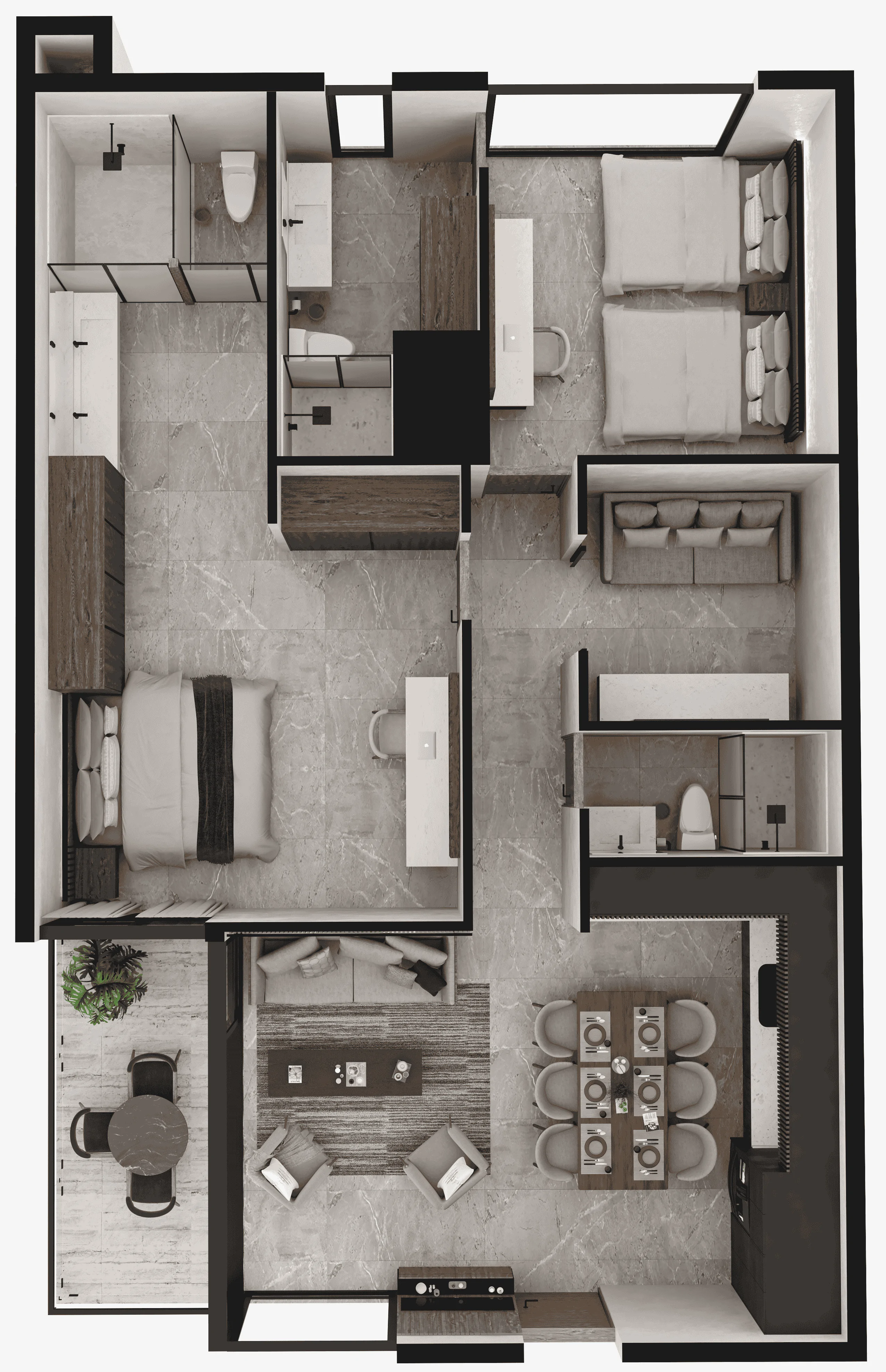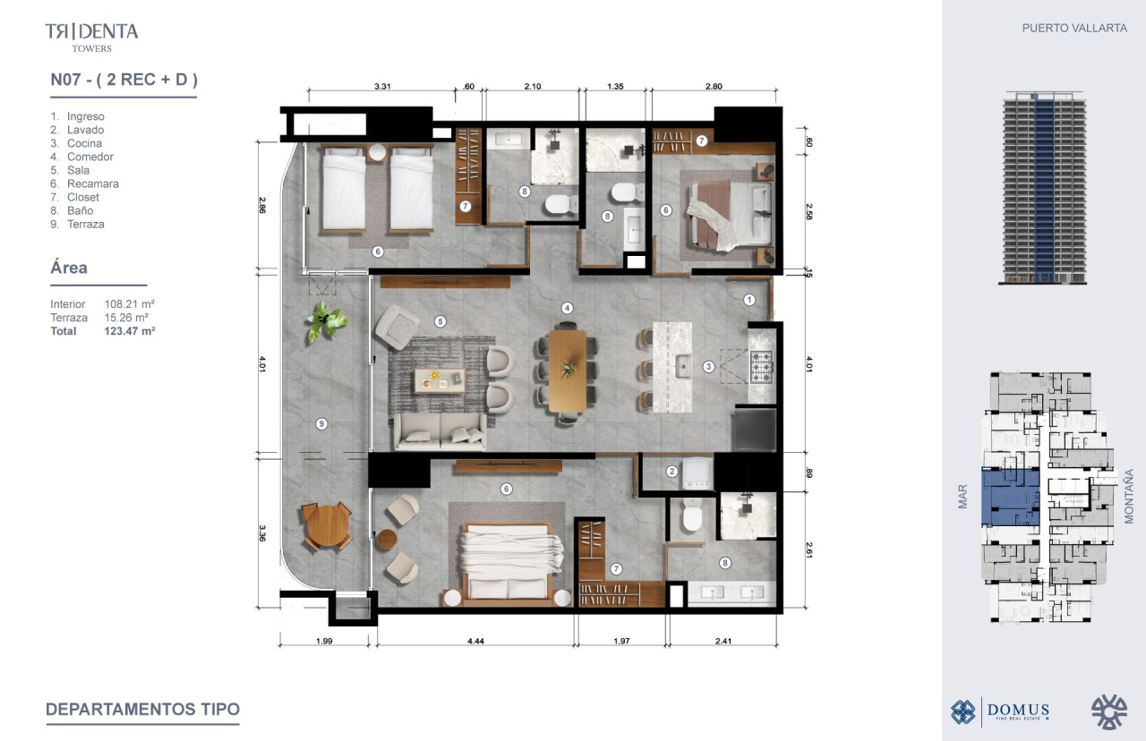 Tridenta Towers presenta su distintiva unidad de dos dormitorios más sala de estar (Tipo 2R + D (B)), una residencia impecablemente diseñada que personifica el lujo y la comodidad modernos en Puerto Vallarta. Con una extensión de aproximadamente 105.96 m² (1,141 ft²) de espacio interior refinado, complementado con una terraza privada adicional de 9.02 m² (97 ft²), con un total de aproximadamente 114.98 m² (1,240 ft²), esta unidad armoniza el estilo y la funcionalidad, lo que la hace ideal tanto para propietarios como para inversores exigentes.